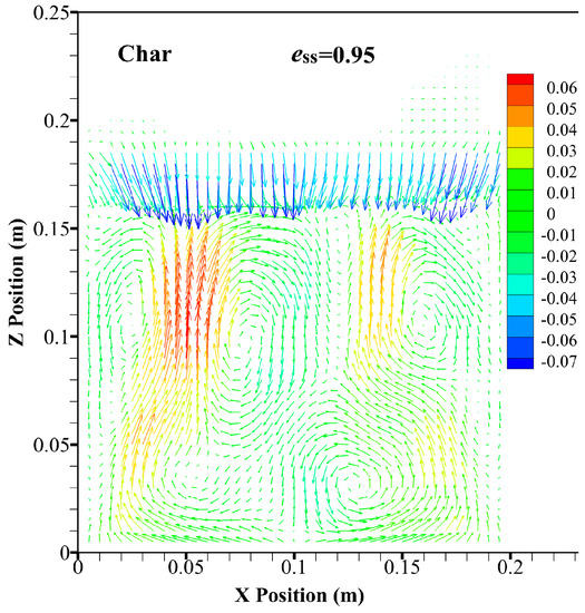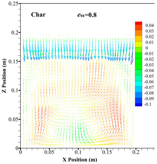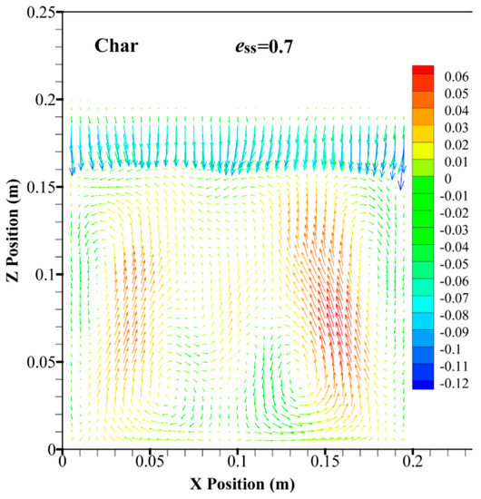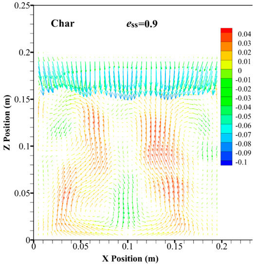 In order to reflect the movement relevance between the jetsam and flotsam, in the case of ess = 0.9, the predicted flow patterns for the flotsam and jetsam are shown in Figure 5 and Figure 6, respectively. The flow patterns for the flotsam and jetsam are quite similar. Two vortices show at the bottom of the bed and two vortices close to the top of the bed. At the bottom of the bed, the particles generally rise towards the wall, whereas they fall down towards the central region. However, at the top of the bed, the movement direction of particles is reversed. The flow pattern obtained in this study is very different from the result obtained by other researchers [24]. In those studies, only two vortices can be found throughout the entire region of the dense bed layer. However, in this study, four vortices are obtained in the simulation. Moreover, the two vortices at the bottom of the bed are relatively close to the centerline of the bed, whereas the two vortices at the top of the bed are generated near the wall. It can also be seen that the distance between the two vortices at the top of the bed is farther than the value for the vortices at the bottom of the bed. This phenomenon might be due to the relationship between the binary particles in density and volume fraction. When the density and volume fraction between the binary particles changes not much [14,24], the segregation of particles does not play a leading role in fluidization process. Hence, in the top and bottom regions of the bed, uniform patterns can be found. However, in this study, a binary particles system with a huge difference between particles in density and volume fraction is used, which causes a much more notable segregation. Hence, the flow pattern of particles at the top region of the bed is different from the result for the bottom region.
