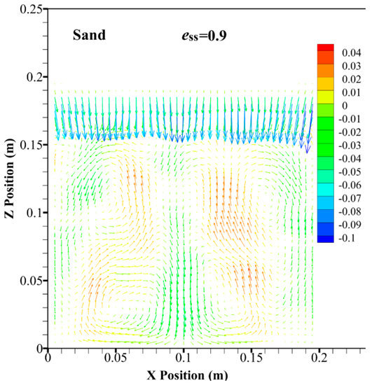 In the cases of ess = 0.7, 0.8, and 0.95, the flow patterns of the flotsam are shown in Figure 7, Figure 8 and Figure 9, respectively. The vortex structures for different restitution coefficients are similar. However, due to the lesser dissipation of granular energy, with the increase in restitution coefficient, the vortex intensity increases. At the bottom of the bed, due to the effect of the inlet gas, the restitution coefficient does not much affect the vortex intensity. However, for the two vortices at the top of the bed, with increase in the height of the bed, the dissipation of granular energy is accumulated. Hence, the effect of restitution coefficient on the flow pattern of particles at the top of the bed is more evident. It can be seen that the vortex characteristic of the two vortices at the top of the bed, as shown in Figure 9, is more obvious when the restitution coefficient increases from 0.9 to 0.95.