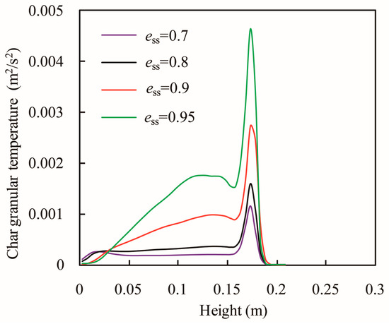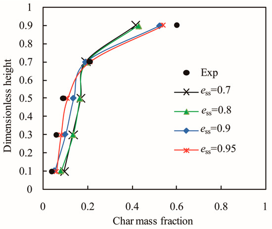 The effect of the restitution coefficient on the distribution of char mass fraction in the axial direction is shown in Figure 15. The char mass fraction is defined as the ratio of the char mass corresponding to the specific height range to total char mass in the bed. With increase in restitution coefficient, the char mass fraction in the upper part of the bed gradually increases, whereas the char mass fraction in the lower part of the bed decreases. In the case of ess = 0.95, the predicted profile well fits the experimental result. In the binary particles system with less difference between particles in density or volume fraction [12], they found that there was a small difference between the simulation results and the experimental data only for low restitution coefficient such as 0.8. However, for the binary particles system with huge difference in density and volume fraction between particles, the predicted degree of segregation compared with experimental result may be too low, when a relatively small value of restitution coefficient is adopted. From Figure 15, it can be seen that the mass fraction profile of char particles along the height direction for ess = 0.95 is quite close to the experimental result.