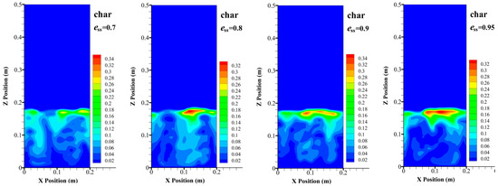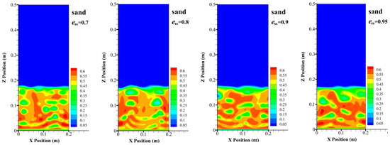The effects of restitution coefficient on the instantaneous volume fraction of char and sand particles are shown in Figure 12 and Figure 13, respectively. Closer to the gas-solid interface, the volume fraction of sand particles is relatively low, which is just the opposite of the value of the char particles. This shows that a strong segregation phenomenon exists in the fluidization process of a binary particle system. With increase in the restitution coefficient, more char particles accumulate at the top of the bed, which shows that the tendency of segregation is more remarkable.
