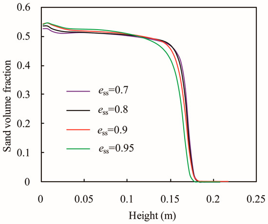 Figure 16 presents the axial profiles of the time-averaged particle volume fraction of the jetsam. Initially, the particle volume fraction along the bed height shows a slight increase, due to the effect of the inlet gas, and then gradually decreases. Closer to the gas-solid interface, the particle volume fraction decreases more sharply. This shows that the splash zone formed by the collapse of bubbles is a small area, which is consistent with previous studies [29,30]. The result from Figure 16 shows that the restitution coefficient had little effect on the axial profile of the jetsam volume fraction.