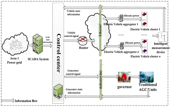 The architecture of a networked frequency regulation system with EVs.