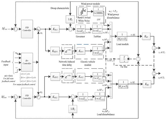 A new two-area closed-loop LFC block diagram with PEVs and wind power is developed and shown in Figure 3. All generators and EVs which are under the management of one aggregator are lumped as equivalent modules.