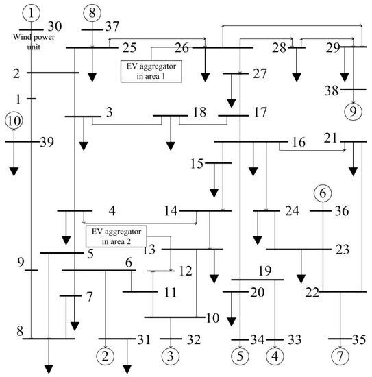 The network diagram of the IEEE 10-unit 39-bus two-area test system with EVs and wind power.