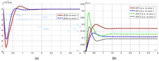 (a) The frequency derivation characteristics of the two-area system; (b) power outputs of generators and EVs.