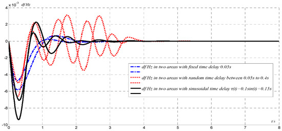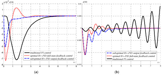 With identical system parameters, studies are performed and comparison of the performances of different control methods, namely the traditional PI control, optimal H∞-PID full-state feedback control, and suboptimal H∞-PID output feedback control are carried out. Figure 7 shows the frequency deviations in area 1 in two scenarios, one with no delay (Figure 7a) and another with 0.5 s delay (Figure 7b).