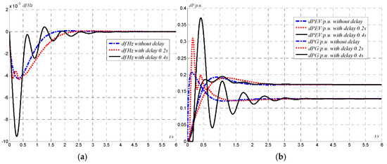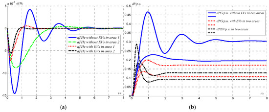 The effect of EVs on system dynamic performance due to abrupt load variations is presented in this section. The suboptimal H∞-PID output feedback control is employed in this study and all system parameters remain intact. Figure 10a shows different frequency deviation characteristics, while Figure 10b shows power output deviations, with and without EVs under a step load change of 0.5 p.u. From Figure 10a,b, it can be seen that, with PEVs’ participation, the overshoot and stabilization times are dramatically shorter. This demonstrates that with proper designed controllers, the dynamic performance of the whole system can be effectively enhanced by using PEVs for frequency regulation.