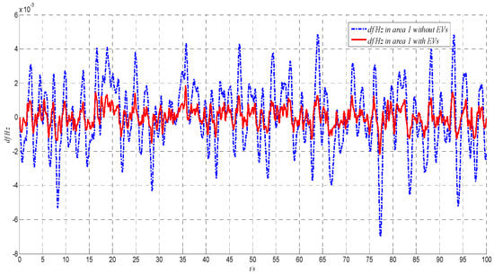 The system frequency deviation in area 1 under wind power fluctuations with and without EVs’ participation.