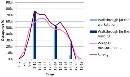 The results from the different methods are compared in Figure 1 for one day. It is to be noted that a certain difference between the three results is logical, because the manual counting gives an accurate momentary result, while the two other results are one hour averages. Another question associated with the methods is whether the people are counted as present if there is clear evidence of their presence (lights and computer on) while they are not physically at their workstation, but are probably in the building. In the surveys, the location was requested and people were counted present if they were on the same floor. In the walk-throughs, people were counted as present if there was clear evidence of their presence, even if they were not at their workstation. The Wirepas device counts a person present if (s)he is in the area of the study. However, if (s)he is in a meeting room, (s)he is counted in a different category.