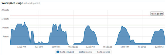 The upper line in Figure 2 represents the number of available seats among the participants, i.e., 17. The lower line is suggested by the used space optimisation tool (Optimaze Active), as the required number of seats for the given number of workers based on the results. Therefore, based on this experiment and these results, the tool suggests that only 12 seats were needed instead of 17, which means a reduction of 30% of workstations. If such a suggestion would be applied in the building in question, that would imply significant savings in costs and CO2 emissions that are produced by the facilities used by the organisation in question. The sample of participants and the length of the experiment are, however, far too small and short to be able to make any conclusions on the space needed for the given building. It also has to be underlined that a too high space efficiency can deteriorate the productivity and well-being of the workers. Therefore, user satisfaction surveys should be carried out in parallel of occupancy evaluations.