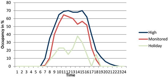 In case study 2, three different occupancy profiles were used to simulate the effect of occupancy on energy consumption. The occupancy profiles are presented later in Figure 3.