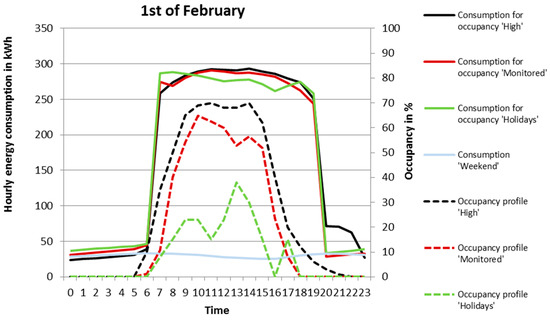 Energy simulations for 1st of February (winter) with different occupancy profiles.