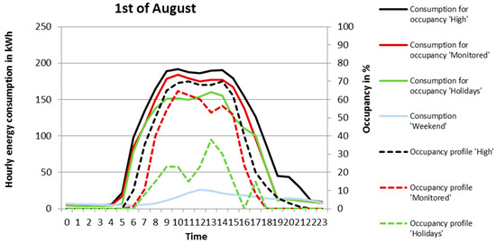 Energy simulations 1st of August (summer) with different occupancy profiles.