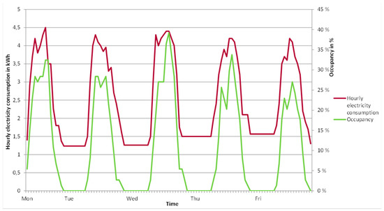 Based on the results of case study 2, the effect of increased occupancy levels on energy consumption is only minimal, as seen in Figure 4. Firstly, this is because it represents a winter day when heating dominates energy consumption. The amount of heating in this case is dependent on the operating times of the building and not the amount of occupants present. Moreover, there is a certain base load (see week-end consumption in Figure 4). In addition, the main heating is switched on at 6 am and switched off at 7 pm, regardless of the occupancy levels during the day. Figure 5 shows the same phenomenon from summer time and a slight effect of occupancy on energy consumption can already be seen. This is mainly due to the fact that the people-related electricity consumption is more important, since the heating loads are minimal. However, in this building, the building automation systems do not react to the actual presence of people, and in buildings which use e.g., demand-controlled ventilation, the effect of occupancy on energy consumption would naturally be more significant. Figure 6 shows that when only people-related electricity is considered (lighting, computers, and devices), the consumption follows the occupancy levels well. The base load is, however, high during night time.