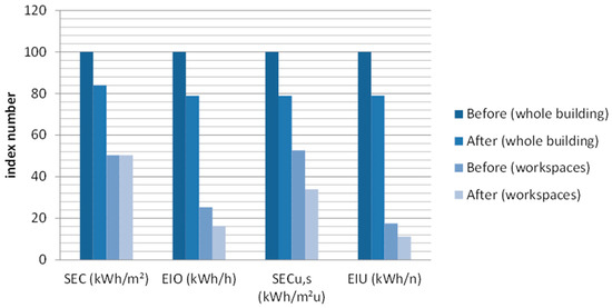 The values of the energy efficiency indicators for the various spaces have been collected in Table 5 for the situation before the renovation and in Table 6 for that after the renovation. To allow for an easier comparison of the relative differences, the values for the whole building and workspaces were indexed so that the value 100 represents the situation before the renovation in the whole building. The results of this calculation are shown in Figure 7. In general, the renovation allows a smaller energy consumption according to all of the indicators.
