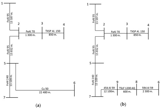 (a) One line diagram of the network as in alternative 1; (b) One line diagram of the network with the proposed new line as in alternative 2.