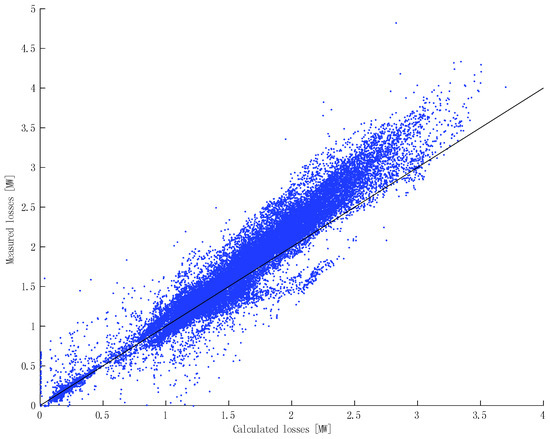 Figure 2 compares the calculated losses per hour for Alternative 1 with the measured losses per hour (where the loss is the sum of the power injection in all nodes). The straight line indicates a perfect match between the calculated and measured losses. The figure shows that the difference between the calculated and the measured losses increased with the size of the losses. This deviation led to a slight underestimation of the yearly cost of transmission losses. The measured losses summed up to 47,371 MWh for the period 2013–2015 while the calculated losses were 43,955 MWh for the same period, i.e., calculated losses were 7.2% less than the measured losses. A similar comparison is not possible for Alternative 2 because this alternative is not yet realized. However, the underestimation would have existed for both alternatives and is therefore not expected to have a major influence on the difference in estimated losses between the two alternatives.