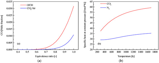 - Yossefi, D.; Ashcroft, S.; Hacohen, J.; Belmont, M.; Thorpe, I. Combustion of methane and ethane with CO2 replacing N2 as a diluent. Modelling of combined effects of detailed chemical kinetics and thermal properties on the early stages of combustion. Fuel 1995, 74, 1061–1071. [Google Scholar] [CrossRef]
