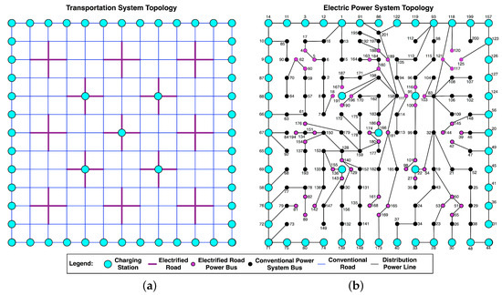 The Symmetrica TEN topology: a test case for transportation electrification sesearch [98]: (a) on left, the transportation system topology; (b) on right, the electric power system topology.
