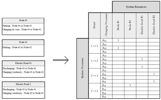 Consider Figure 3. For simplicity of discussion, four resources have been extracted from the Symmetrica test case topology. On the left, they are represented as class blocks in UML/SysML. Node #1 is a charging station. It has two methods (or system processes), park and charging, at Node #1; with “Null Charging” or with “Charging by Wire” . Node #2 is a parking lot. Like the charging station, it has a parking process. Link #1 is an electrified road. It has a system process of Transport Vehicles from Node #1 to #2 with battery discharging . It also has the process “charge wirelessly” during the transportation between nodes. Similarly, Link #2 has two system processes in the opposite direction. Figure 3 on the right shows the associated portion of the TEN knowledge base. There are 16 rows to account for the four possible transportation processes combined with four possible charging processes. There are 4 columns; one for each of the classes mentioned above. The matrix is then filled with ones where there are feasible combinations of system processes and resources (i.e., structural degrees of freedom) [96,97,98]. This small subsection has 7 degrees of freedom. Naturally, the system knowledge base is highly sparse and must be computationally implemented as such [50].