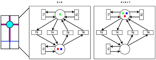 The state vectors and represent the number of vehicles at a Petri net place or undergoing a timed Petri net transition respectively [63]. The incidence matrices and are derived from the TEN knowledge base, and the firing vectors and are derived from the vehicle firing matrix [63].