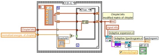 - Modify the obtained matrix containing the parameters of each detected Gaussian chirplet. Find the dominant components in the examined signal. Figure 11 shows the part of the block diagram of the virtual analyzer that examines the matrix of the chirplet parameter and computes the modified adaptive spectrogram. The normalized energy of single detected atom is compared with the inserting threshold. The rejection of a single chirplet is carried out using the procedure that compares the normalized energy of each elementary function with the threshold and removes the corresponding column of the matrix.