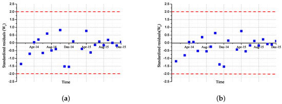 In order to further analyze the rationality of regression, the standardized residual and standard deviation distribution of carbon emissions and sulfur emissions in Equations (9) and (10) are shown in Figure 1 and Figure 2.