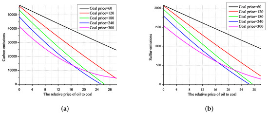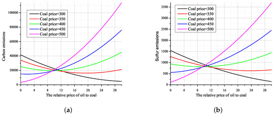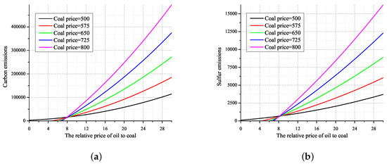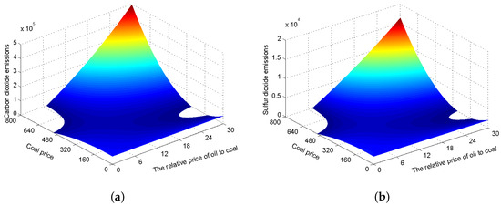 In Figure 7, the changed trends of carbon and sulfur emissions are completely different from the variation trends in the range of coal price between 0–300 (Yuan/tce). When the coal price is from 500 (Yuan/tce) to 800 (Yuan/tce), the evolution of carbon emissions and sulfur emissions show a similar increasing trend regardless of the value of relative price. Further, greater values of coal price show faster growth ratio. Thus, the reduction in both consumer price of coal during 500–800 (Yuan/tce) and relative price is beneficial to decrease CO and SO emissions. Compared with variation trend during 0–300 (Yuan/tce), the decrease of relative price becomes more pressing and urgent in the market of energy consumption.