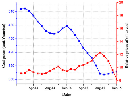 The aim of the government’s regulatory strategies are to save energy and reduce emissions via price adjustment. This means that energy price reform is the most urgent energy issue in China, and energy price should be a good starting point to study emission problems. Some researchers pointed out that government regulation keeping domestic energy price at a low level led to energy price distortions, which could result in wasteful energy consumption and environmental deterioration [24,25,26,27]. The distorted energy price containing lots of information of government policy lost the feature of market at the product-level. This paper studies how variation trend of energy consumer price affects carbon and sulfur emissions at the consumption-level. Consumer price is the end-use price after government regulation. It is the synthesis of actual price including taxes, surcharges, rebates, and so on. The research at the level of consumption guarantees that results in this paper contain the influence of government regulation. The main contributions of this paper to the literature are as follows: firstly, consumer price of coal and oil, the daily consumption quantity of coal and oil, and related carbon and sulfur emissions during 2014–2015 are captured; second, our investigation extends previous study by analyzing the possible correlation between energy price and carbon/sulfur emissions; third, we get the optimal relative price of oil to coal in different price ranges of coal at the consumption-level, and policy implications for environment improvement are suggested.