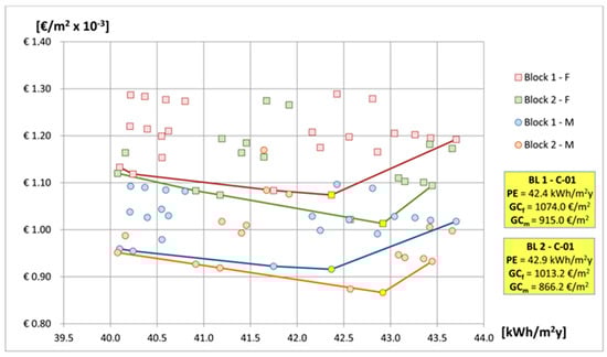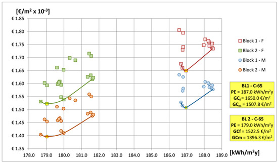 The energy uses are heating, cooling, ventilation, hot water, and lighting. In addition, CO2 emissions have been estimated according to the variants and technical combinations of reference buildings 1 and 2. The reduction of both global primary energy consumption and CO2 emissions have been derived and compared to the base case. Table 8 and Table 9 show these results in detail: REF 1 block 1 + block 2, and REF 2 block 1 + block 2. The final values for each solution define the primary energy (PE, kWh/m2y) and the global cost (€/m2), which represents the abscissa and the ordinate of the global cost curve. The definition of the curve allows evaluating the lowest point, i.e., identifying the best solution.