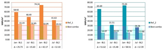Eight possible technical solutions have been evaluated to improve the energy efficiency of the reference buildings, both for REF 1 and REF 2 (Table 5). As mentioned above, the reference building is composed by two blocks.