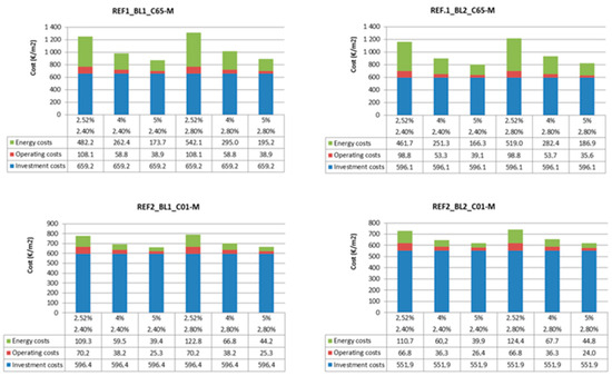 The software ProCasaClima 2015 ver.3.0 has been used to estimate global costs calculated as the sum of initial investments and annual costs. Initial investments are for the efficiency measures of the building envelope and technical systems, while annual costs consider replacement and operating costs. In accordance with the regulation [4], financial and macroeconomic calculations have been assessed. The financial analysis comprises final costs including Value-Added Tax (VAT) and all taxes without abatement costs of greenhouse gasses. The macroeconomic analysis considers CO2 emission costs and excludes taxes and incentives. Table 10 show the global costs of the two blocks for the reference building 1, while Table 11 refers to the reference building 2.