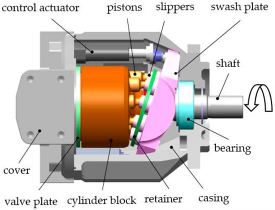 - Xu, B.; Hu, M.; Zhang, J.; Su, Q. Characteristics of volumetric losses and efficiency of axial piston pump with respect to displacement conditions. J. Zhejiang Univ. SCIENCE A 2016, 17, 186–201. [Google Scholar] [CrossRef]