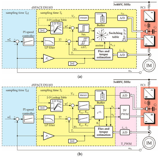 Schemes with constant switching frequencies most often use space-vector pulse width modulation (SVPWM), wherein, instead of hysteresis controllers, linear (PI) or non-linear (sliding mode) are introduced. In this article, discrete-time PI controllers are used for torque and flux control (PIDTC), the parameters of which are set according to the recommendation from [25]. A detailed scheme for DTC controller implementation is presented in Figure 4b. Both schemes use the same torque and flux estimators, outer PI speed controllers, and identical sample times for control loops, as designated in Table 1.