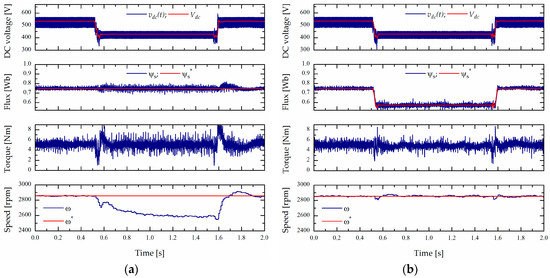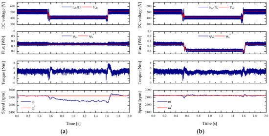 The examined PIDTC scheme uses SVPWM in the linear zone without over-modulation, and the obtained IM stator voltages are slightly lower compared to the classical DTC that uses vectors in hexagon vertices. In this case, the rms value of the fundamental voltage harmonic is reduced, and consequently the drop in speed is slightly higher, as shown in Figure 7a. Applying the proposed flux-weakening algorithm, the rejection of DC-link reduction is a little bit slower (Figure 7b) because of the reduced stator voltage (compared to C12DTC) caused by linear SVPWM.