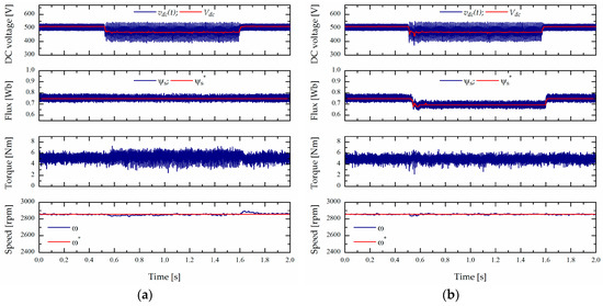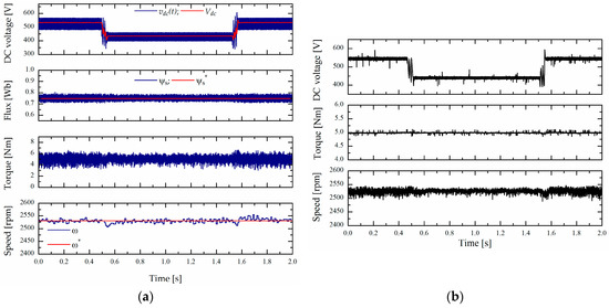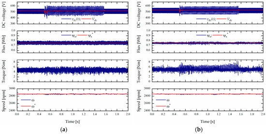 In the following experiments, instantaneous values of DC-voltage vdc(t), mean value Vdc, reference ψs*, estimated ψs stator flux, estimated electromagnetic torque Te, reference ωm*, and actual ωm speed are measured and acquired with ControlDesk software (version 3.7.5).