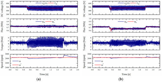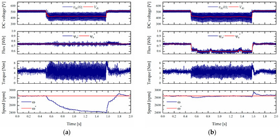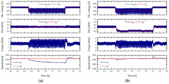Experimental results of PIDTC drive response under voltage sag type D disturbance with h = 1/3 and with (a) constant stator flux reference and (b) field weakening according to the proposed algorithm and with torque control loop bandwidth ωbw = 2π⋅400 [rad/s].