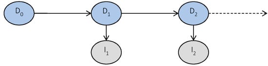 Dynamic Bayesian networks are especially appropriate for problems evolving with time like deterioration, as they consist of a sequence of time slices, each connected only to the previous and following time slice. Dynamic Bayesian networks can be applied for modelling of a Markov chain. For a Markov chain, the future is independent on the past, given the present, and it is modelled as a chain of nodes, each node pointing to the next. For RUL estimation, the nodes in the Markov chain can represent the deterioration state, e.g., damage size. When a Markov model is used, the RUL estimate only depends on the current deterioration state. For wind turbine blades, inspections are associated with uncertainty, and the current deterioration state is not directly observable. Therefore, a hidden Markov model is applied, as illustrated in Figure 1. The time slices generally contain two nodes: a node for the true deterioration state () with states, and a node for the observation of the deterioration state () with states.