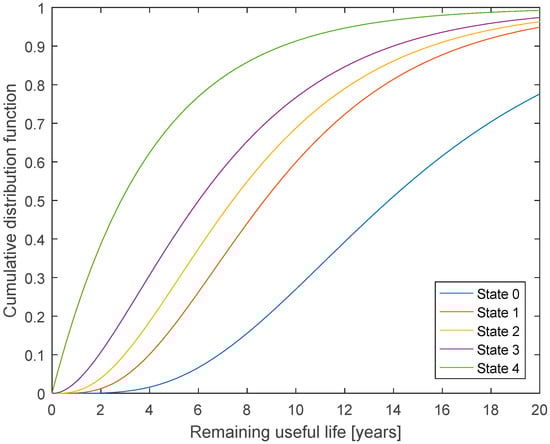 Cumulative distribution function for remaining useful life for current state zero to four.