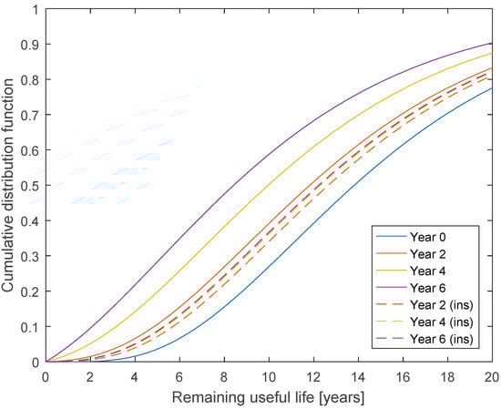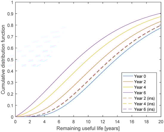 Figure 5 shows two examples of how the RUL estimate is updated using information from CM, together with the case, where RUL is just updated using the information that the useful life has not yet ended. In the first example (CM: a in Figure 5), the CM system is assumed to have the outcome “no detection” in all time steps, until the RUL estimate is made. In the second example (CM: b in Figure 5), the CM signal is assumed to change to “low alarm” after four years. With a CM system with “no detection”, the curve almost stops to move after four years. However, when the first “low alarm” is received after four years, the curve moves to a much lower estimate of RUL, and when “low alarm” is continuously received from the fourth to the sixth year, the curve has moved further. The RUL estimates updated using CM can be used as basis for decisions on inspections using a risk-based approach []. Decision rules for inspections can for example be based on the probability of failure within a reference period or the mean (or median) remaining useful life, and the optimal decision rule can be determined as the one resulting in the lowest expected lifetime costs.