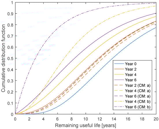 Cumulative distribution function for the remaining useful life 0, 2, 4, and 6 years into the lifetime. The dashed lines (CM: a) are for CM system with no detection, and the dash-dot lines (CM: b) are for CM with no alarm until four years into the lifetime, and for low alarm after four years.