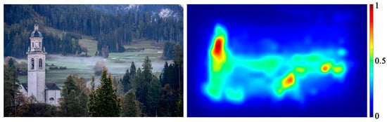 The proposed saliency method is largely based on the concept of the saliency model, a concept borrowed from the computer vision domain. It calculates the “visual saliency”, which means the probability of a particular image region attracting human visual attention in comparison to its surrounding. There are many different approaches to calculating visual saliency (for further detail, see Section 2.2). Usually, the contrast comparison mechanism of the human visual system is imitated by a saliency model, and a saliency map that predicts the visual saliency distribution of the corresponding visual scene is then produced (see Figure 1). On a scale from 0 to 1, a more conspicuous region will receive higher values in the saliency map, indicating that this region has a higher probability of being paid attention to by human eyes in this very visual scene.