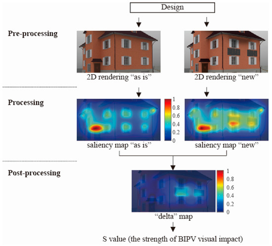 Using a 2D rendering containing the BIPV system and the building of interest, the visual attention information of this visual scene can be analyzed and transformed into visual impact. It offers a quantified comparison between the visual impacts of different BIPV designs whose strengths are difficult to weigh qualitatively and instinctively. The principle and effectiveness of the saliency method have already been established in former works [30,31,32,33] and will be explained briefly in the following section. The workflow of the method is shown in Figure 2.
