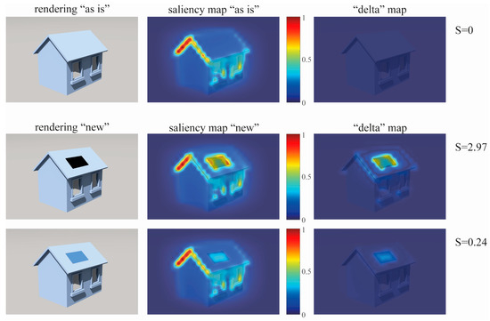 An abstract application demonstration of the proposed saliency method. It shows with the example of a simple house how the different colors of a roof-integrated BIPV installation will affect the final S value. In the first row, it can be seen that, when there is no change in this visual scene, the “delta” map is entirely deep blue and the resulting S value is 0, meaning there is no resulting visual impact. Then, it can be seen that a black patch on the roof (second row) is generating a higher S value than a blue patch (third row), because the black patch is more “salient” than the blue one. The Graph Based Visual Saliency (GBVS) model was used to generate the saliency maps “new” and the “delta” maps [39].