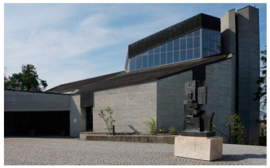 The third design was an improved variant of the design PVBig (see the responding figure in Table 1). Instead of standard PV modules, custom-made small modules of size 54 cm × 54 cm were used in this version (see Figure 9). This design was architecturally sensitive, as the smaller BIPV modules more closely resembled the existing roof tiles and their patterns than the large standard modules. Utmost respect was paid to the architectural appearance of the existing church complex with no strange lines introduced to disturb the present silhouettes. As with the PVBig design, the BIPV modules were also very visually accessible for visitors from almost all viewpoints, but still managed to be subtle by imitating the existing look of the roof tiles. However, the drawbacks to such a cautious and careful design approach include the fact that it would only be achieved through heavy planning work, high costs, and complicated technical requirements, e.g., an abundance of electric cables and extensive care.