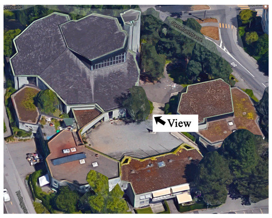 St. Michael, a church located in Lucerne, Switzerland, was used as the case study. The management team of the church hoped to integrate BIPV on its building envelope to demonstrate their support towards a greener future and to enhance the building’s energy efficiency. The most likely location for such an installation was the sloped roof of the church, as it faced south, had an optimal tilting angle and was covered in old roof tiles that had to be replaced. Other areas of the building envelope were to be left as is to preserve the appearance of the existing architecture. Three designs were proposed and presented to the management team and heritage departments of Lucerne (canton and city), so that they can choose one that they find most appropriate. The first design had a conceptual and bold approach, while the other two were more practical and cautious. As the building is in downtown Lucerne city, the BIPV visual impact was to be kept as low as possible. Figure 4, Figure 5 and Figure 6 show the church in its current situation, an aerial view of the church with the indication of the viewpoint for 2D rendering “as is”, and the rendering itself, respectively.