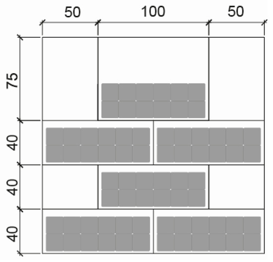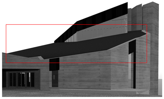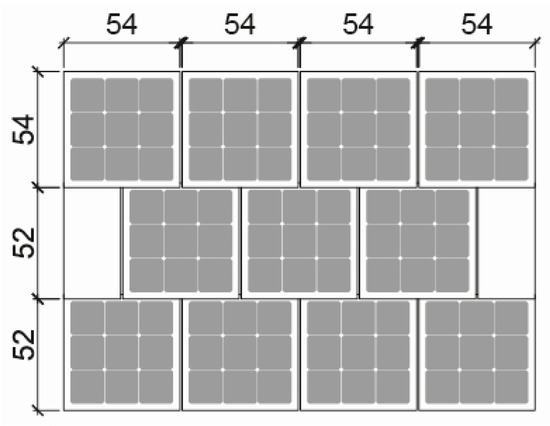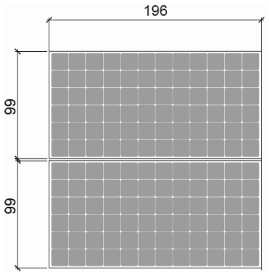 This design intended to apply the arranged BIPV arrays on the upper side of the sloped roof adjacent of the light tower. Standard BIPV modules, each with a size of 196 cm × 99 cm, were to be split into two rectangular groups and follow only the edges of the light tower (see the responding figure in Table 1). Figure 7 shows a partial layout plan of this design. This location is barely visible to the visitors due to its height, but can still achieve a demonstrative effect. This design also required less time and effort in installation and less technical equipment, e.g., cable connections. With the huge advantage in cost, the drawback of this design was that the outlines of the two PV groups did not exactly follow the profile of the church and was hence not ideal architecturally. In general, this design is a very simplified solution without much architectural concern.
