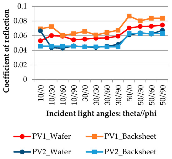 The reflection property of two typical mono-crystalline BIPV modules was measured and applied to the 3D digital models of the designs to ensure that realistic RADIANCE renderings could be generated to study how color, homogeneity, and reflectivity affected the BIPV visual impact. PV Sample 1 (Figure 10) is a custom-made, single mono-crystalline cell module with regular glass used as front glazing. The backsheet area color is dark grey and slightly lighter than the black wafer area. PV Sample 2 (Figure 11) is a module with four mono-crystalline cells. The black color of the backsheet area is quite similar to that of the wafer area. For both PV samples, two typical testing points were chosen: one in the backsheet and one in the wafer area, as they are the two kinds of areas on the PV module, resulting in four testing points in total. Figure 12 shows the reflection coefficients measured with a Goniophotometer. The results show that the reflection coefficient of PV Sample 1 was higher than that of PV Sample 2.