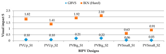 Visual impact S values of different BIPV designs as per the IKN and GBVS saliency models.
