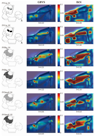 Both saliency models GBVS and IKN showed that the visual impact of PVUp design was higher than that of the PVSmall (see Figure 14). The low S values of PVUp (compared to that of PVBig designs) could be traced back to the small visible area of the modules. A corresponding rendering (first row, Figure 13) showed that when installed very high up on the roof, only a little of the BIPV could be seen from an observer from the selected viewpoint. As per the GBVS saliency model, PVUp_S1 and PVUp_S2 had identical S values. Calculations from the IKN(Harel) saliency model showed that in the PVUp design, switching from PV Sample 1 to the less reflective PV Sample 2 resulted in a decrease of the S value.